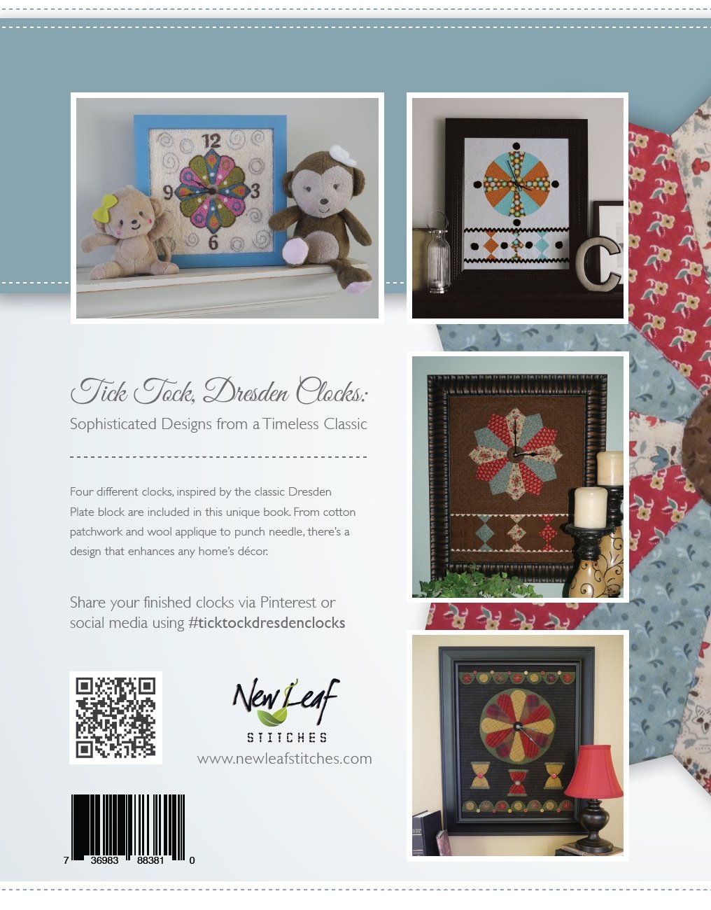 Four different clocks, inspired by the classic Dresden Plate block are included in this unique book. From cotton patchwork and wool applique to punch needle, there’s a design that enhances any home’s décor.